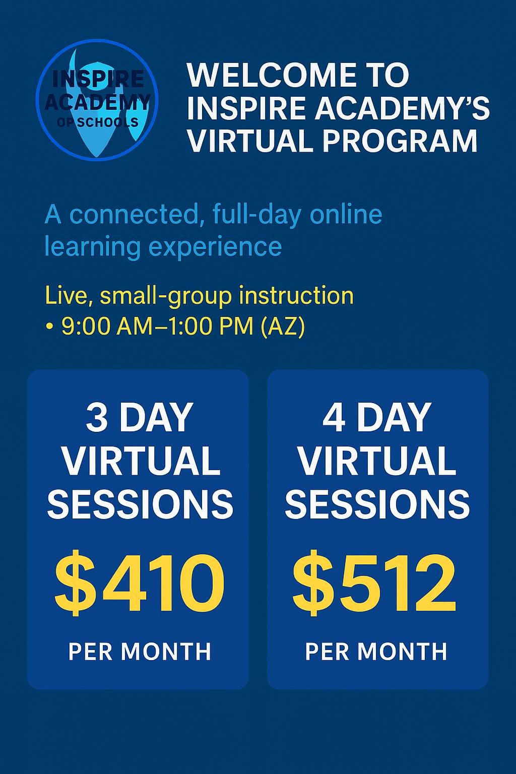 Join our full-day online program designed for kids to work alongside our in-person Microschool and our Inspire Academy excellence. From 9:00 AM to 1:00 PM, students engage in interactive lessons with our in-person Microschool students, collaborative projects, and fun enrichment activities all from the comfort of home.